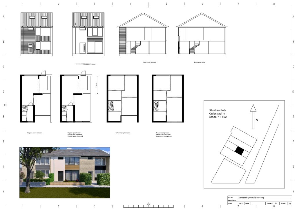 Op verzoek kunnen tekeningen worden geleverd. Plattegronden, aanzichten, doorsneden en overzicht tekeningen zijn allemaal mogelijk. Bouwtekeningen en berekeningen, bv voor vergunningaanvraag behoren niet tot de mogelijkheden. Onder een voorbeeld.